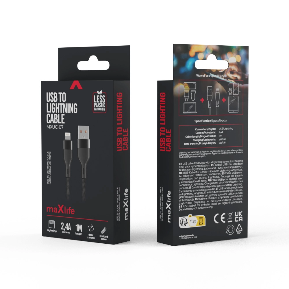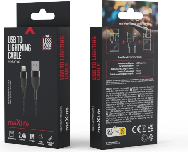 Durable USB–Lightning charging and data cable by Maxlife with nylon braiding and reinforced connectors. Ideal for fast 2.4 A charging and reliable data transfer. Length 1 m for convenient everyday use at home, in the office, and on the go.