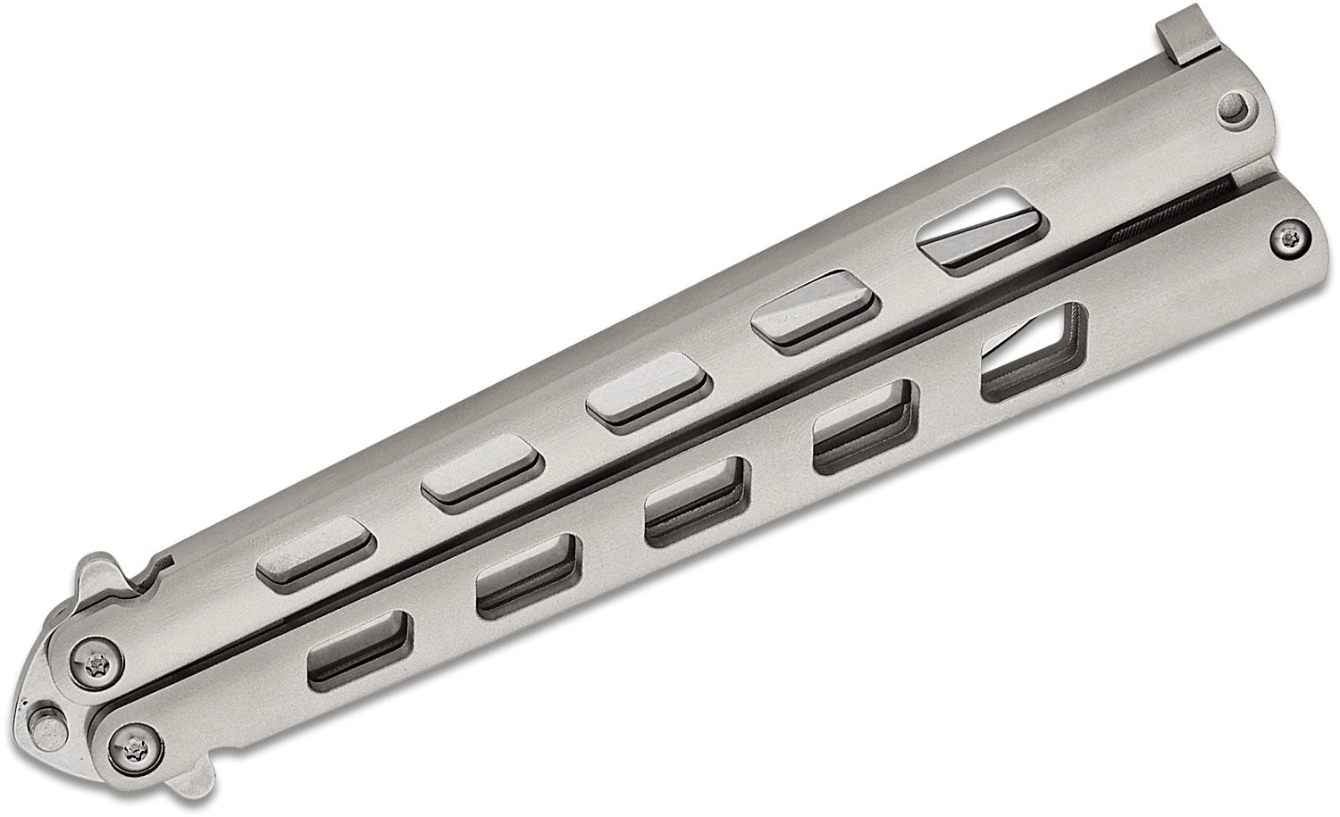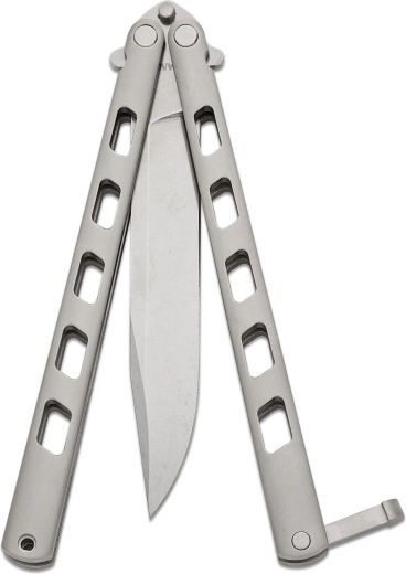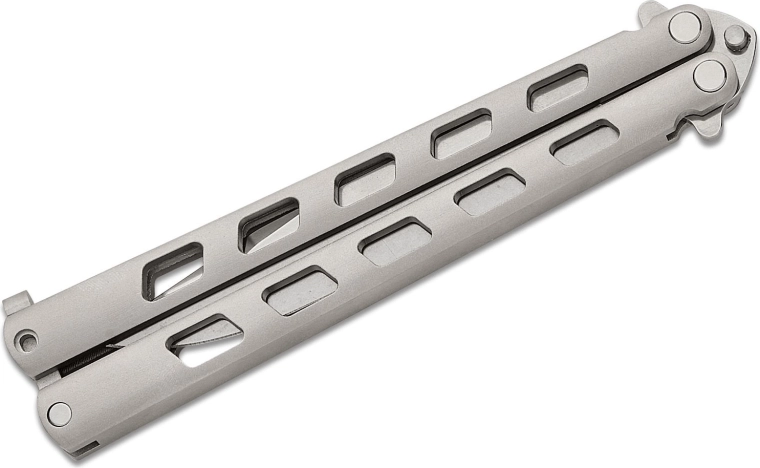 Traditional balisong enthusiasts will appreciate the mechanical latch, which locks the knife securely in both the open and closed states, and the smooth rotation of the handles around the blade pivots for quick and safe manipulation.