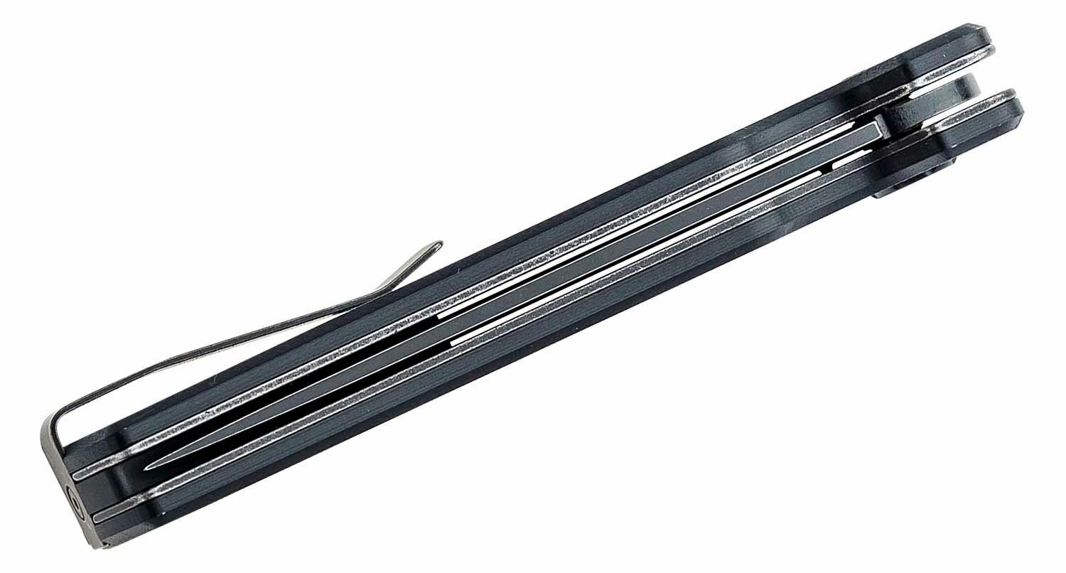 The ergonomic black G10 handle offers high traction even in wet or cold conditions. A practical pocket clip allows deep carry, and a lanyard hole expands securing and retrieval options. The knife is ideal for tactical scenarios, the outdoors, and EDC.
