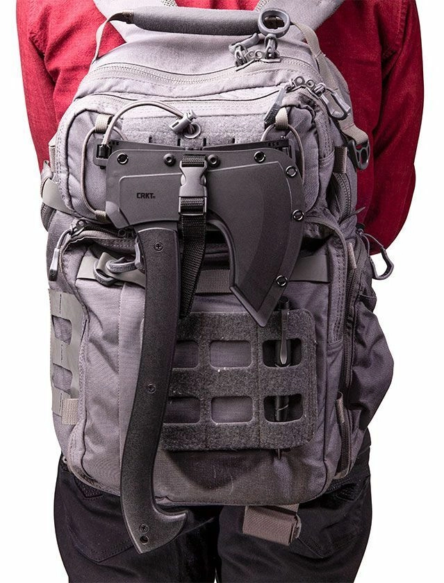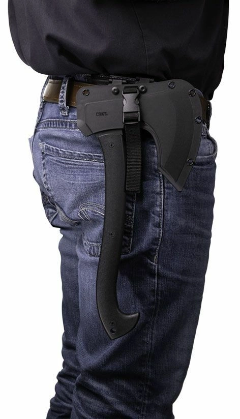 The modern outdoor axe CRKT Skeggox, inspired by Viking design, offers a durable SK-5 carbon steel blade, a full-tang construction for maximum strength, and an ergonomic GRN handle for a secure grip. It includes a thermoplastic sheath with options to attach to a backpack or belt for safe carry.
