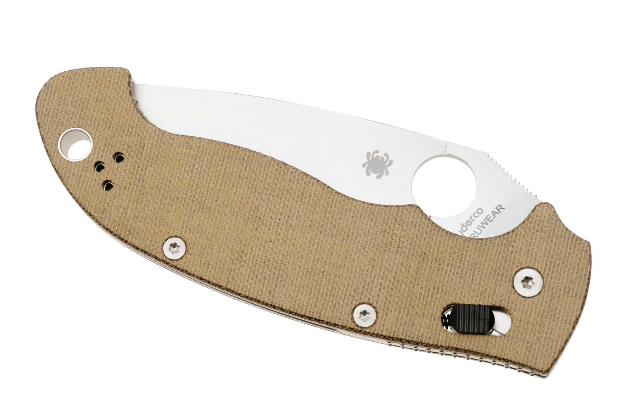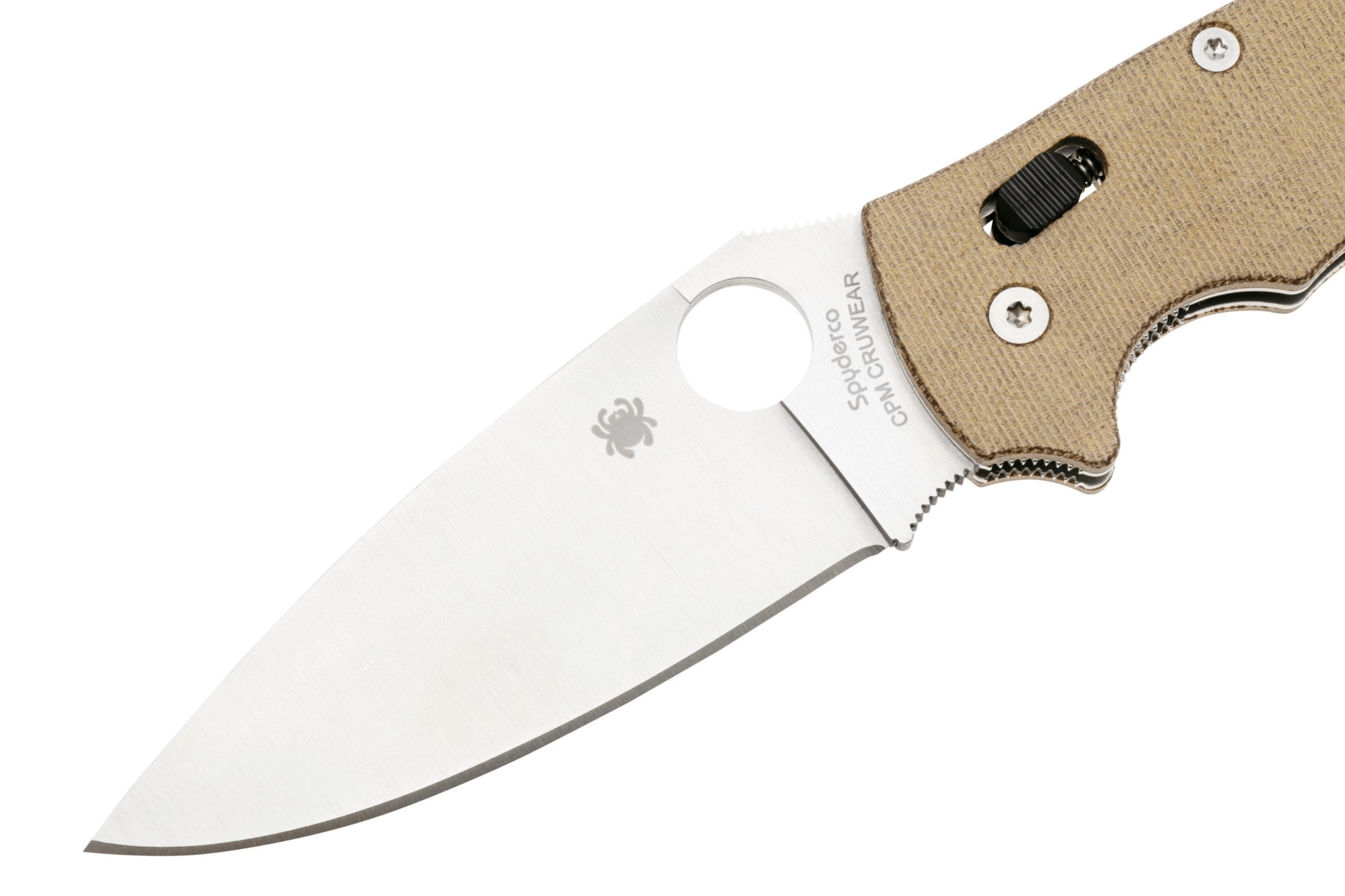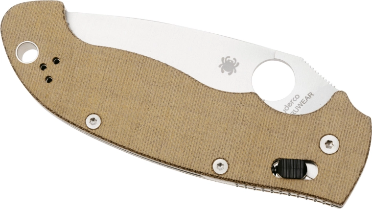 The patented SpyderHole enables quick, ambidextrous opening, and the innovative Spyderco Ball Bearing Lock delivers exceptional strength and silky-smooth action, appreciated by both right- and left-handed users. The Canvas Micarta scales in brown are pleasantly textured, lightweight, and highly durable—visually appealing and secure in hand even when wet.