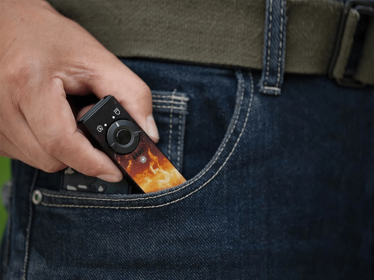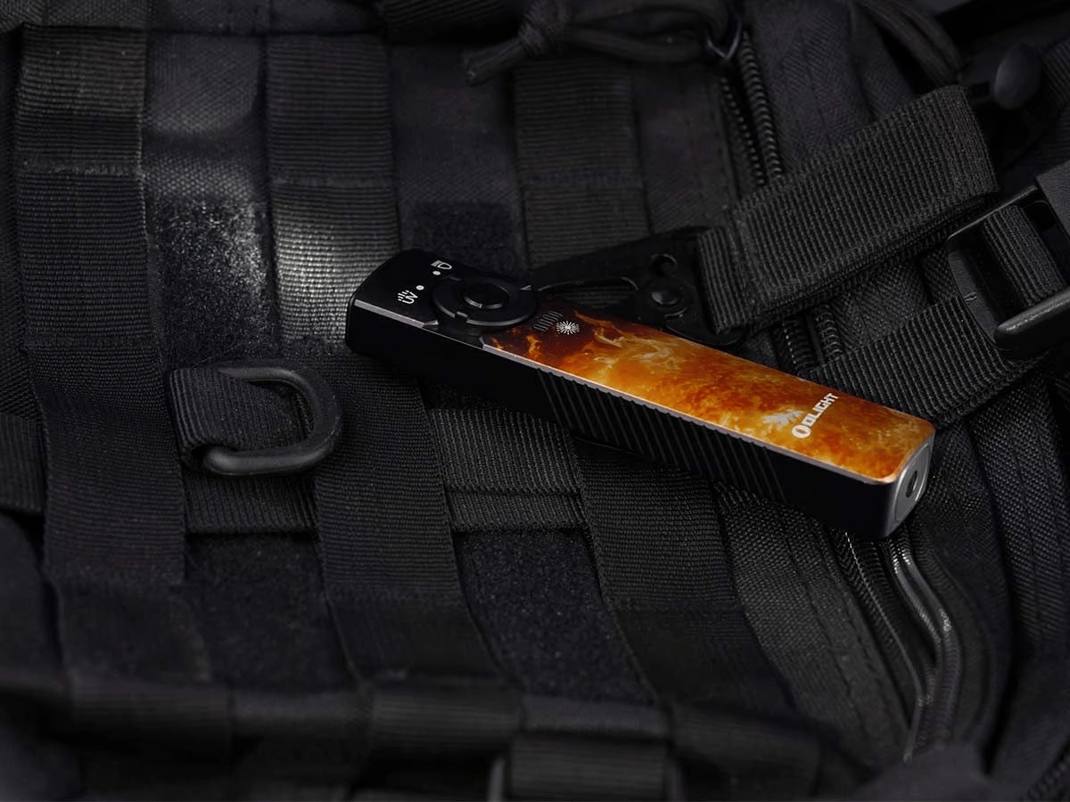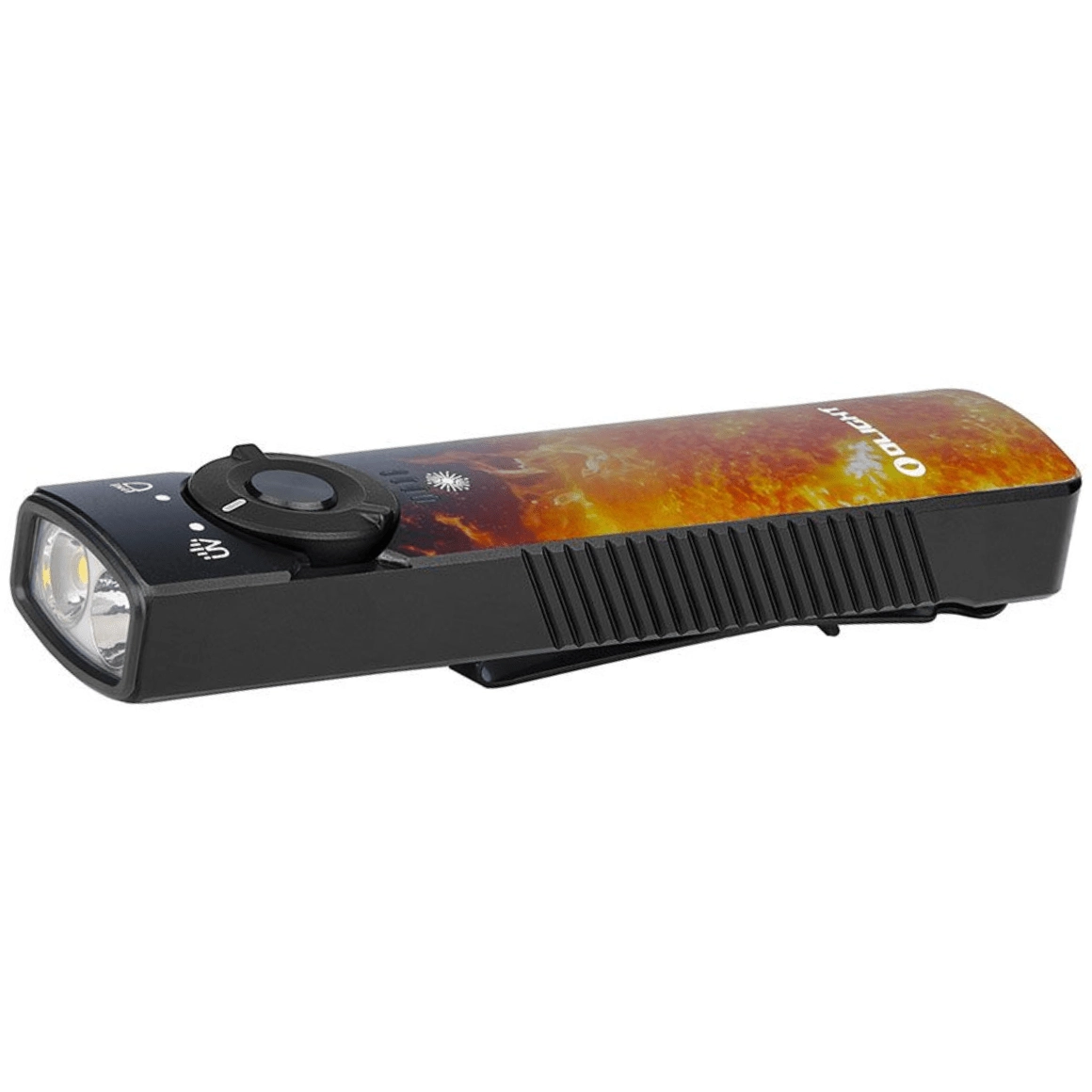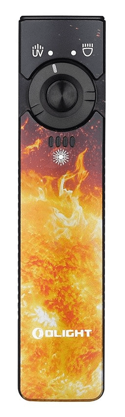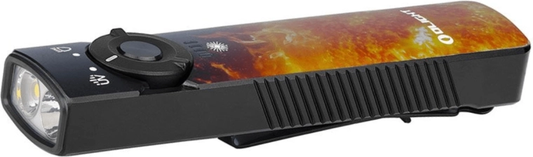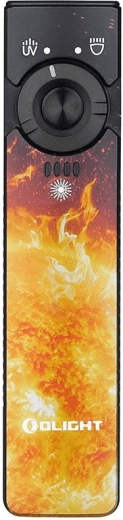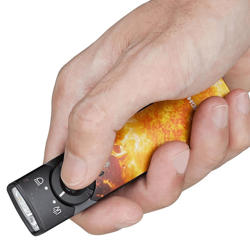 The OLIGHT Arkfeld UV Sunburst Limited is an EDC flashlight featuring a unique flat aluminum-alloy body, excellent ergonomics, and dual light sources: a white LED with 5 brightness levels (up to 1,000 lm) and a 365 nm UV diode (580 mW). Easy operation is ensured by a central button with a mode selector and clear indicators.