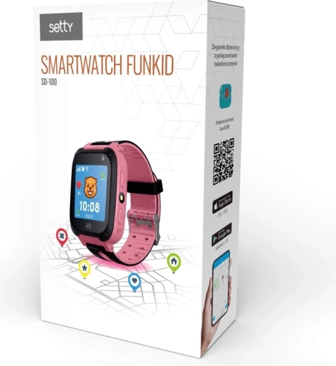 The Setty FunKids SD-100 kids’ smartwatch in pink combines safety, fun, and easy control. With an LBS locator, voice monitoring, and an SOS button, you can keep track of your child’s location and situation. It features a touchscreen, chat, remote camera, flashlight, and a math game. The 400 mAh battery lasts up to 3 days on standby, and the watch is compatible with both Android and iOS.