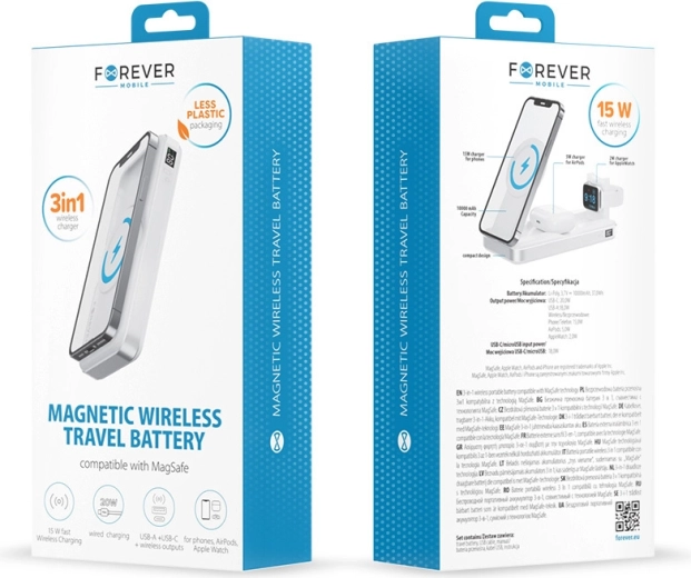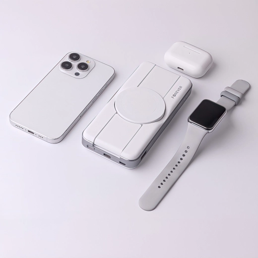 Enjoy the freedom of no cables and all‑day power. This 3‑in‑1 portable power bank combines MagSafe magnetic wireless charging for your phone, a dedicated surface for AirPods, and a stand for Apple Watch. Its compact, lightweight body slips easily into a pocket or bag, making it perfect for everyday use and travel.