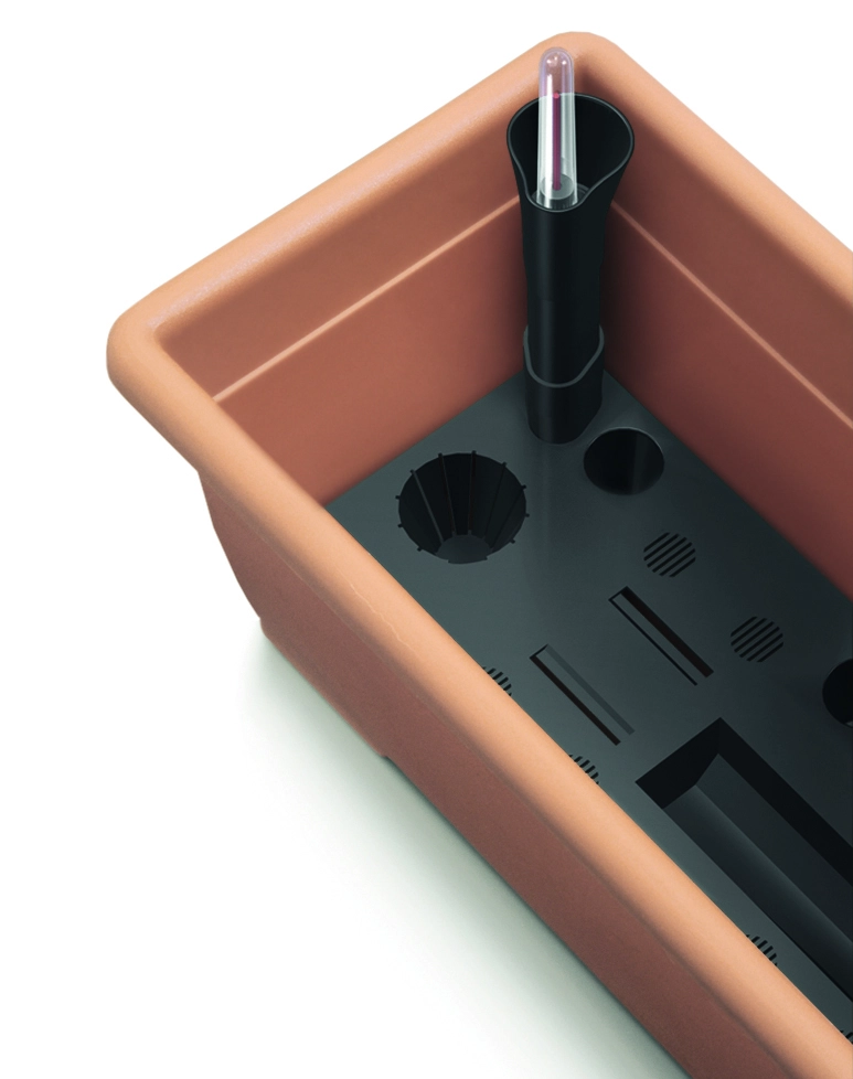 A stylish 50 cm planter in terracotta color, ideal for balconies, terraces, and windowsills. Thanks to the integrated self-watering system, it maintains a stable water supply and reduces the frequency of watering. Durable UV-stable plastic with a smooth surface ensures a long service life even outdoors.