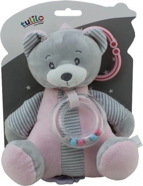 The rattle placed at the teddy bear's neck makes sounds when moved, stimulating the child's auditory perception.