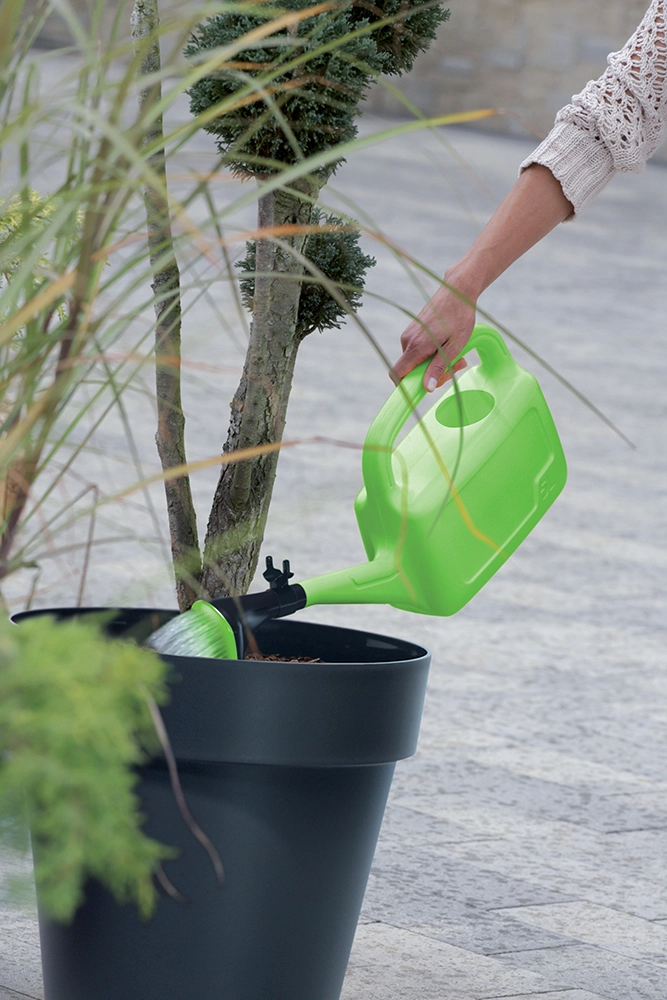 The can is made of durable plastic that better withstands impacts and sunlight. Its compact dimensions make it easy to use indoors, on balconies, and on smaller terraces. A practical holder for the rose on the spout minimizes the risk of loss and keeps everything within reach.