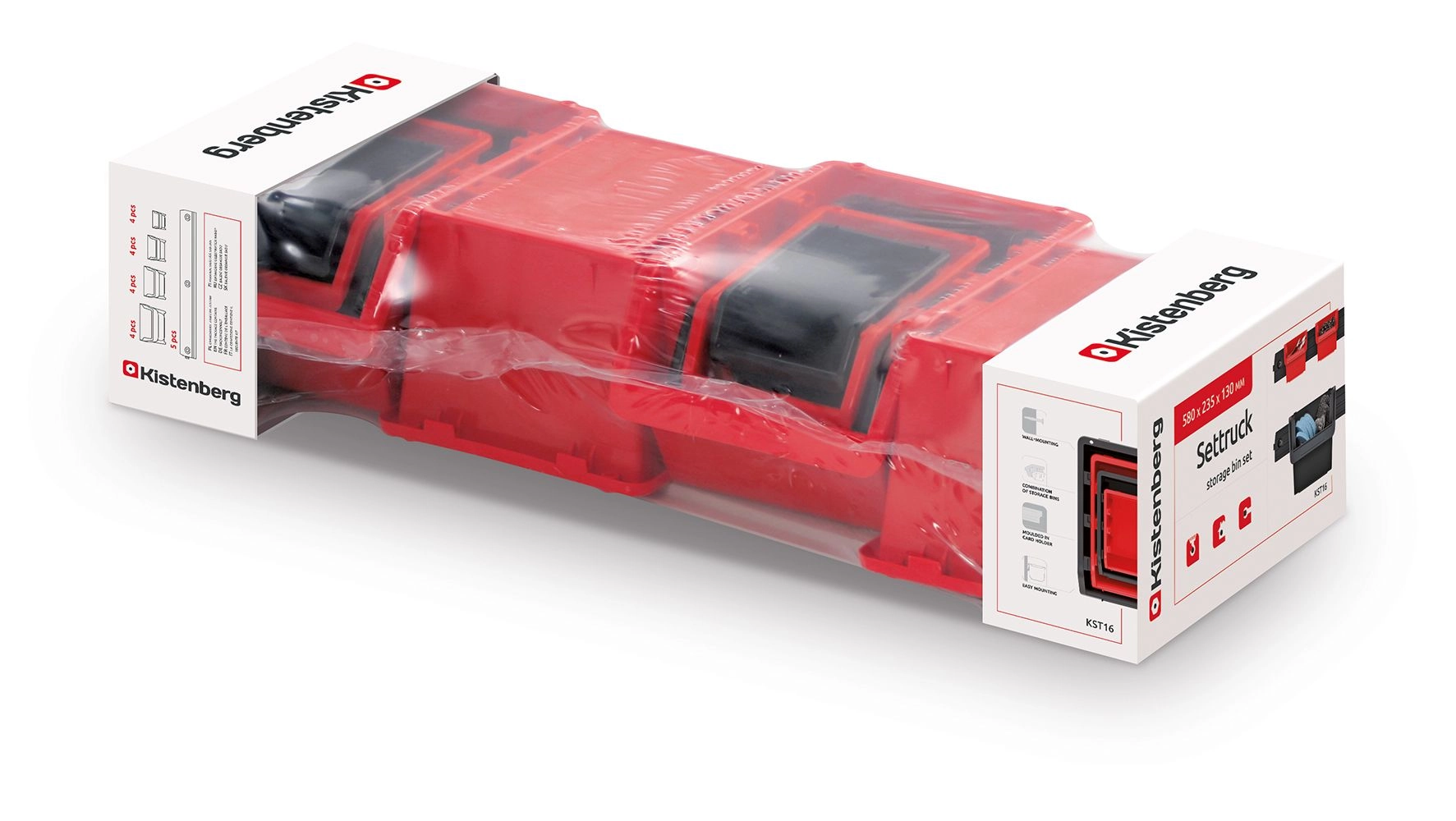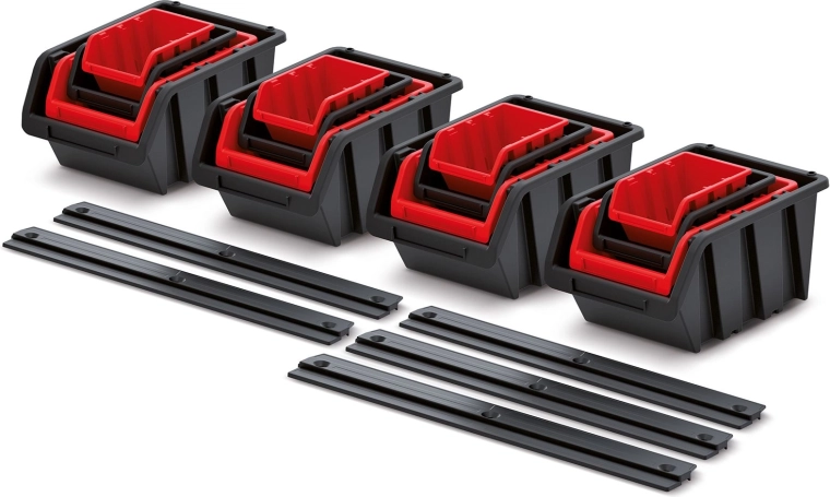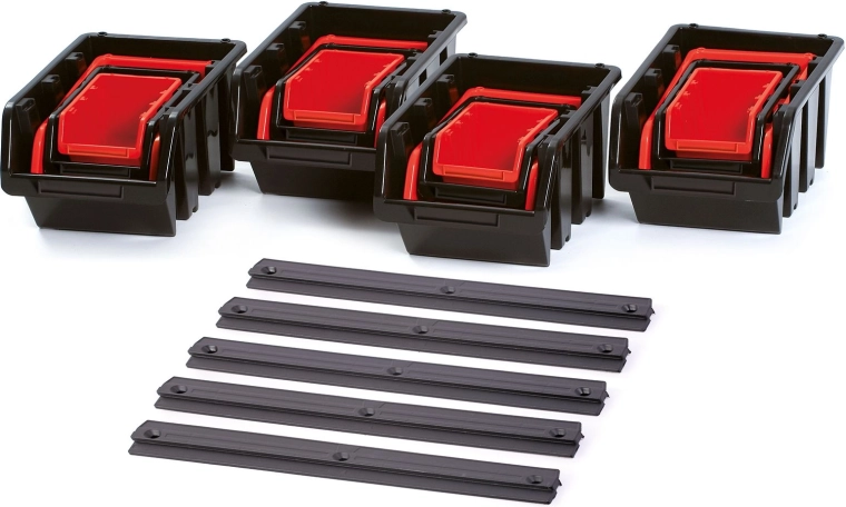 The practical SETTRUCK wall-mounted box set provides organized storage for small parts and tools in the workshop, garage, and home. A combination of 16 durable plastic boxes in 4 sizes and 5 mounting rails enables efficient use of space, quick access to contents, and flexible arrangement to suit your needs. A tough polymer blend ensures long service life and resistance to mechanical damage, while the black/red color scheme supports easy visual sorting.