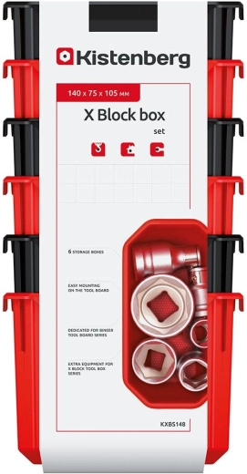 Keep small fasteners and accessories organized. The set of six durable KISTENBERG X Block plastic boxes offers a smart organizing solution: an open top profile for excellent visibility, stable stacking, and the option to mount on pegboards or wall systems. Thanks to compact dimensions of 140 × 75 × 105 mm, they fit easily into shelves and mobile carts.
