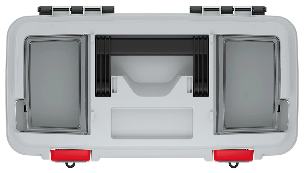 - grey (lid), black body, red latches