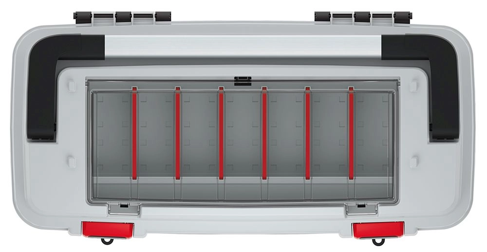 The transparent lid and red dividers provide a quick overview of the contents and safely separate screws, bits, and other small items.