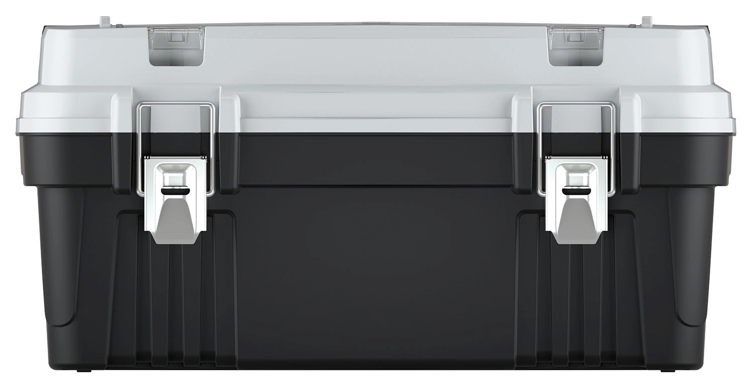 Two front metal latches lock the lid firmly, keeping the contents safe during transport and heavy-duty use.