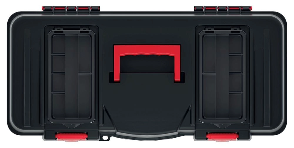 The durable CALIBER plastic tool box provides safe, well-organized, and reliable storage for workshop and construction use. The robust polymer construction withstands impacts and harsh weather, features a removable tray, transparent lid organizers, and a load capacity up to 21 kg for comfortable transport of heavier tools.