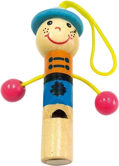 Cheerful wooden whistle in the shape of a figurine is a great tool for developing children's hearing and a fun accessory that also serves as a signal or football whistle.