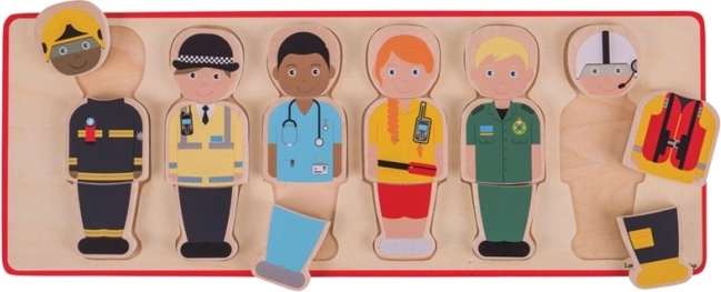 Make education fun with the wooden puzzle Rescue Team. This colorful puzzle features six rescuer characters—firefighter, police officer, doctor, and more, fitting into carved slots on the board.