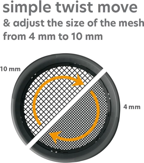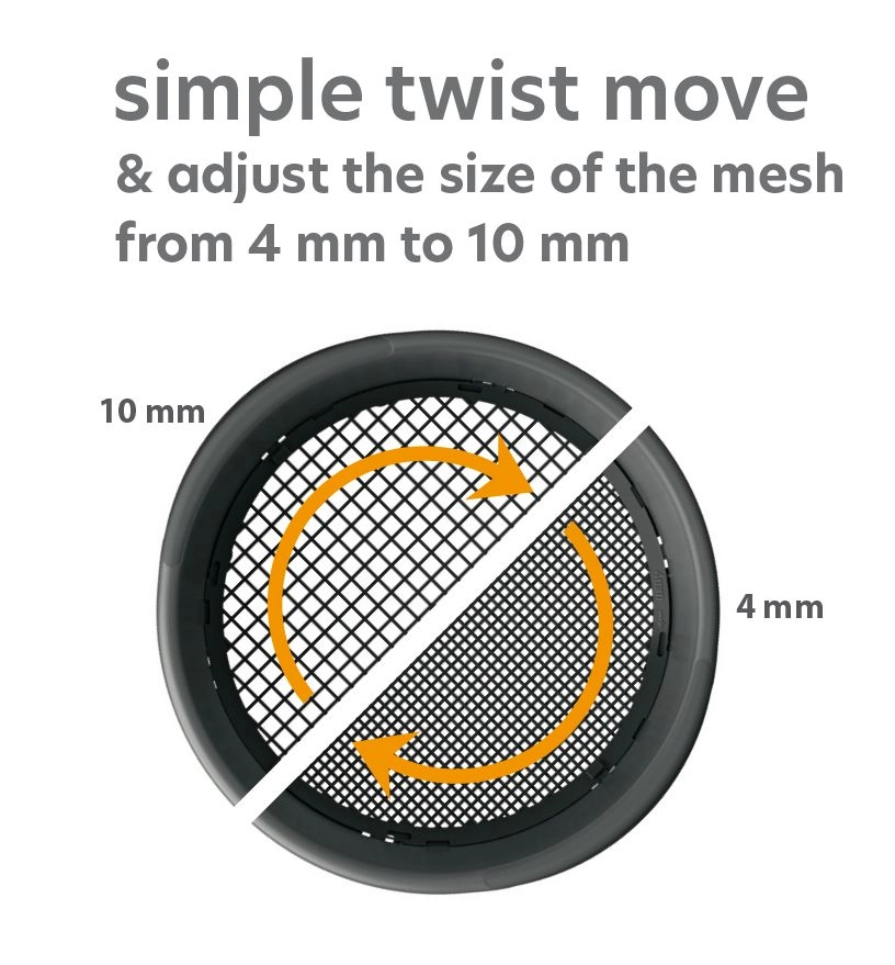 Thanks to the sturdy plastic, the sieve is weather-resistant, easy to clean, and comfortable to hold. The smoothly operating rotating ring enables quick mesh changes without swapping the frame—ideal for a variety of gardening tasks.