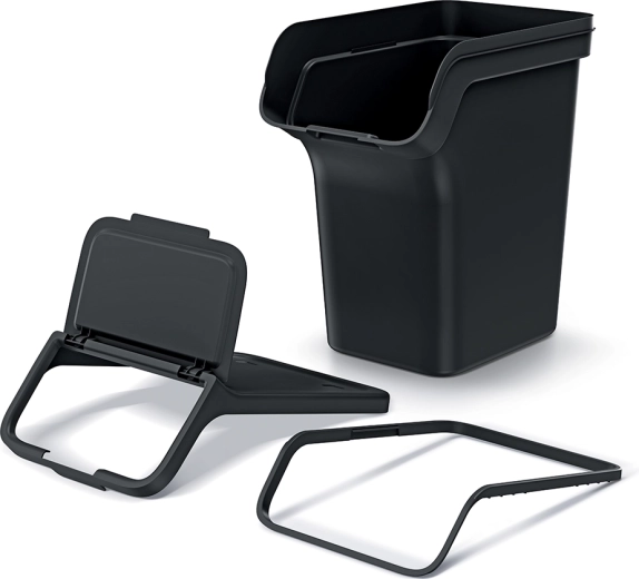 Each bin is made from recycled black plastic, resistant to everyday wear. Inside you’ll find a removable frame for securing bags, which makes replacement easier and keeps the interior clean. Thanks to its compact dimensions, the set fits perfectly in kitchens, pantries, offices, and smaller workplaces.