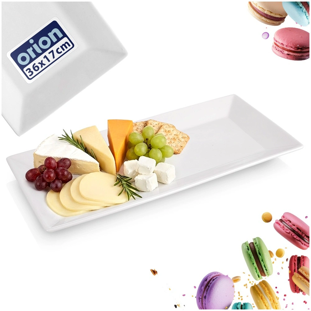 Elegant porcelain serving plate in pure white for stylish serving of appetizers, cheeses, sushi, and desserts. Rectangular shape 35 × 17 × 2 cm with slightly raised edges ensures stability and an aesthetic presentation of dishes. Suitable for the dishwasher and microwave, ideal for everyday use and festive serving.