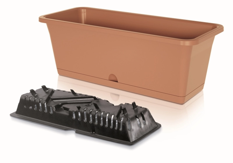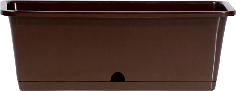 The elegant CAMELIA planter box, 59.5 cm long in brown, is ideal for growing flowers and herbs on balconies, terraces, and windowsills. It features a classic design with slightly rounded edges, durable plastic resistant to weather conditions, and a practical drainage hole to remove excess water. Thanks to its lightweight construction, it is easy to handle and maintain.