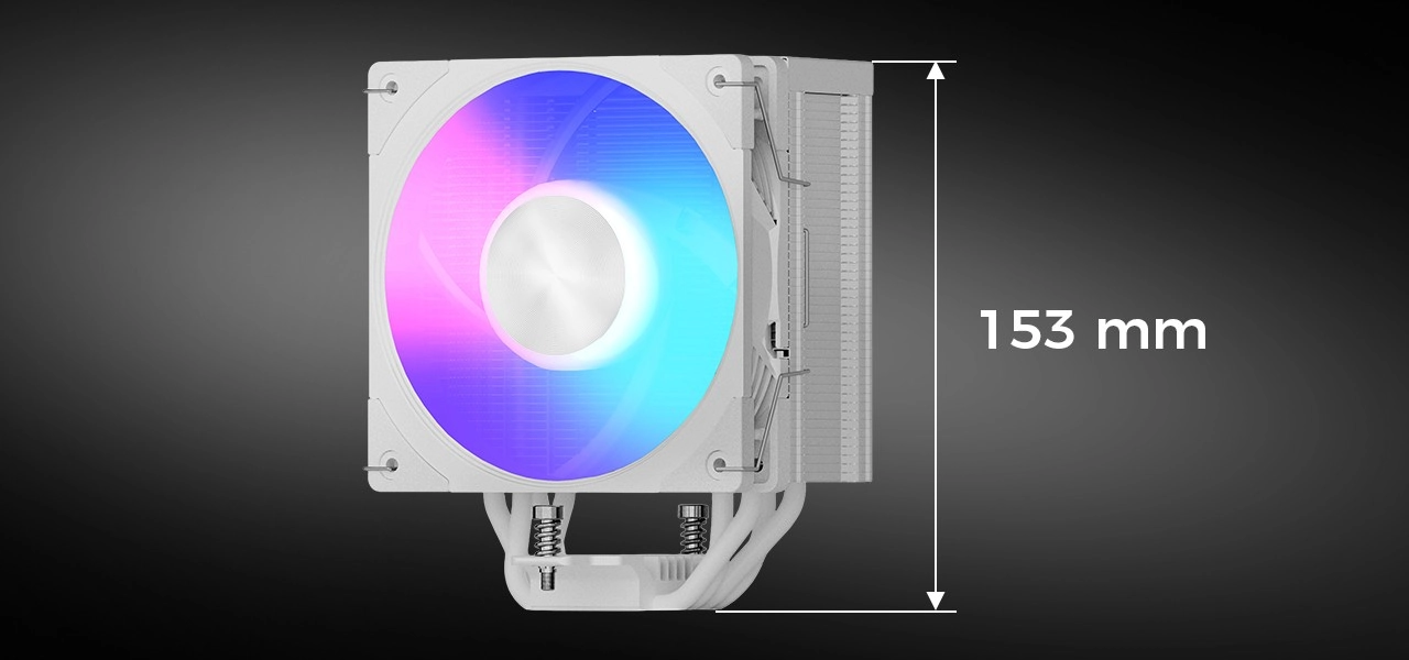 A stylish and efficient CPU air cooler with ARGB lighting, a 120 mm PWM fan, and four heat pipes for reliable cooling. It offers quiet operation (approx. 28 dBA), high airflow (up to 75 CFM), and compatibility with most ATX builds thanks to its compact 153 mm height. A thermal paste is included for quick and precise installation.