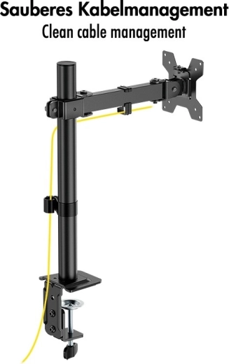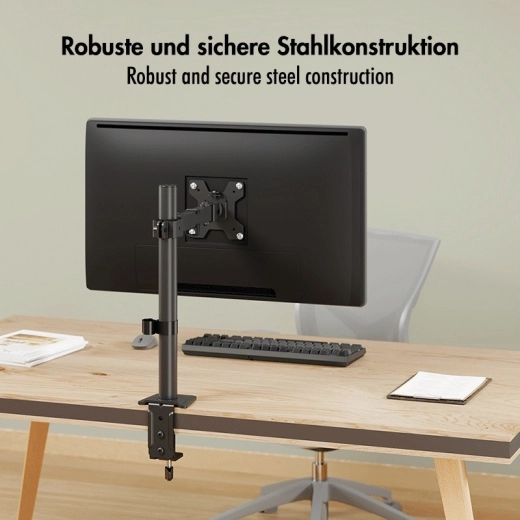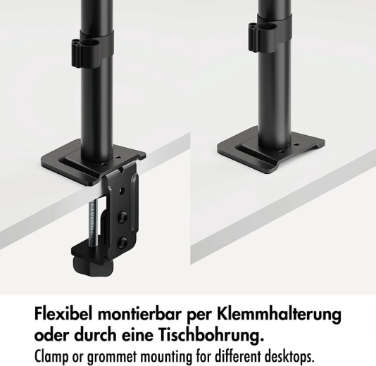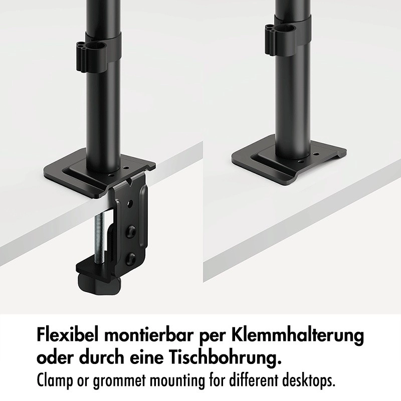 The stable steel build combined with quality plastic elements provides reliable support for monitors up to 10 kg. Installation is quick and flexible — choose between edge clamping (C-clamp) or grommet mounting. Integrated cable management and a removable VESA plate simplify setup and everyday use.
