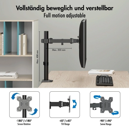 The mount lets you position your monitor precisely for ideal ergonomics. With a 40.8 cm guide pole and an articulated arm with up to 20.2 cm reach, you can easily adjust screen height, depth, and position. A tilt range of ±45°, swivel ±90°, and 360° rotation (pivot) make it easy to switch between landscape and portrait modes.