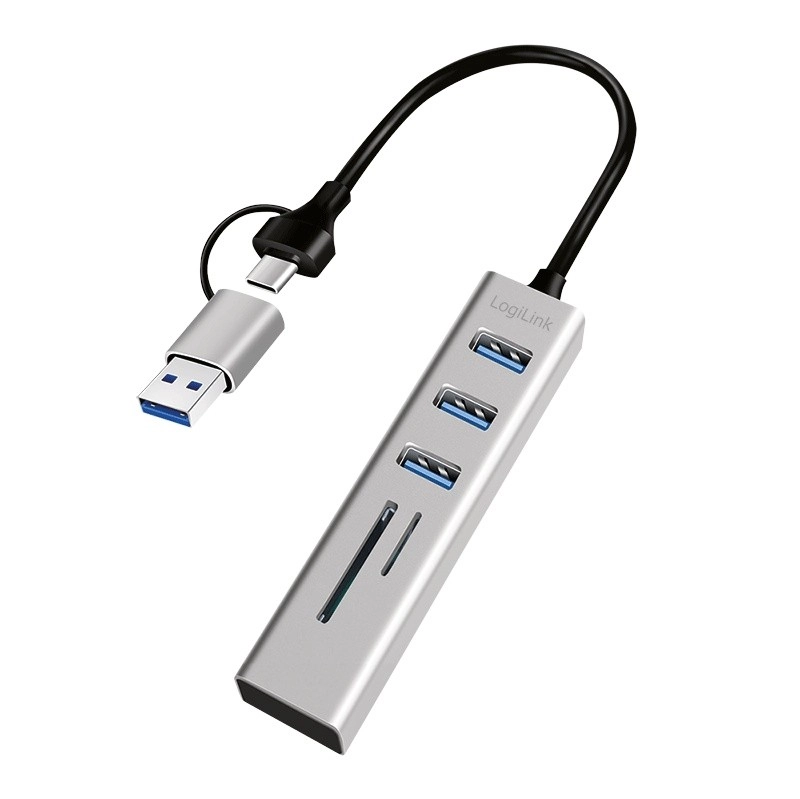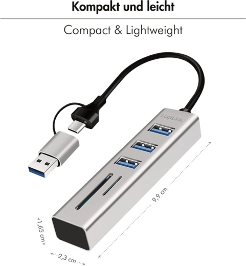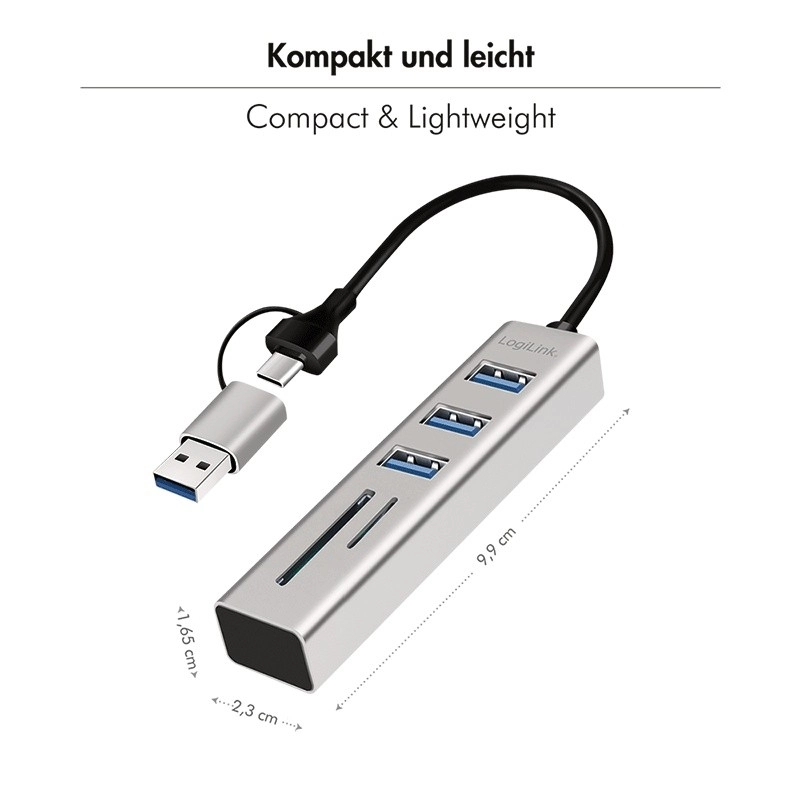Expand your laptop, phone, or tablet connections in seconds: this compact LogiLink hub offers 3× USB 3.0 for fast transfers, a built‑in SD and microSD card reader, and a handy 2‑in‑1 cable with USB‑C and USB‑A adapter. Ideal for travel, with an aluminum look and plug & play setup with no installation.