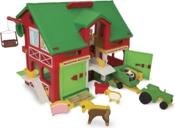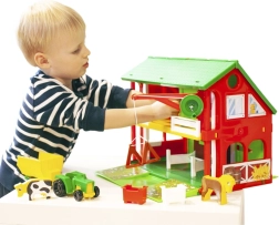 The barn with opening elements and animals sparks imagination, teaches animal care, and develops social skills during cooperative play.
