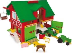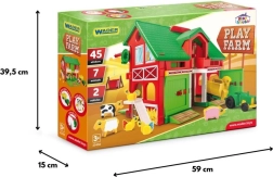 The Play House Farm play set transports children to a realistic farm environment. The two-story house, about 37 cm tall, offers plenty of interactive elements: opening doors, an elevator, a crane, and ramps. It also includes a tractor with a trailer, farm animal figures (horse, rooster, hen, cow, pig, sheep), and stickers to complete the details.