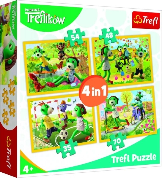 Make kids happy with a colorful set of 4 independent puzzles featuring themes from the popular Treflik Family series. Each picture has a different number of pieces, so both beginners and slightly more advanced puzzlers will enjoy it. Thanks to the special paper that reflects light, the pieces are easier to distinguish and assembling is more pleasant.