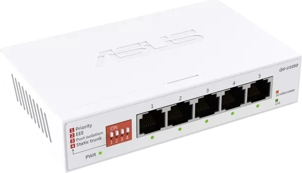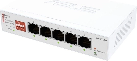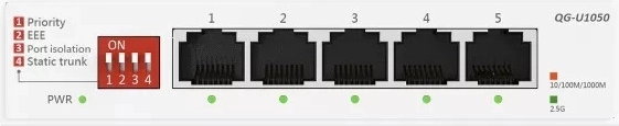 Accelerate your home or office network with the 5-port unmanaged 2.5G switch QG-U1050. It offers plug-and-play installation, a silent desktop design, and four intelligent modes (priority, EEE, port isolation, static trunk) for higher performance, security, and energy savings. Use your existing CAT5e cabling and unlock the full potential of Wi‑Fi 6/7, NAS, 4K streaming, and gaming PCs.
