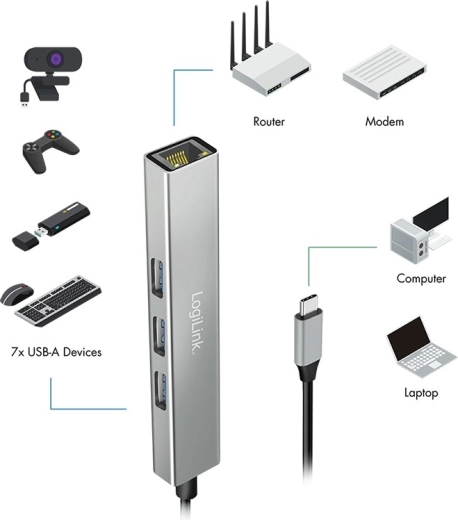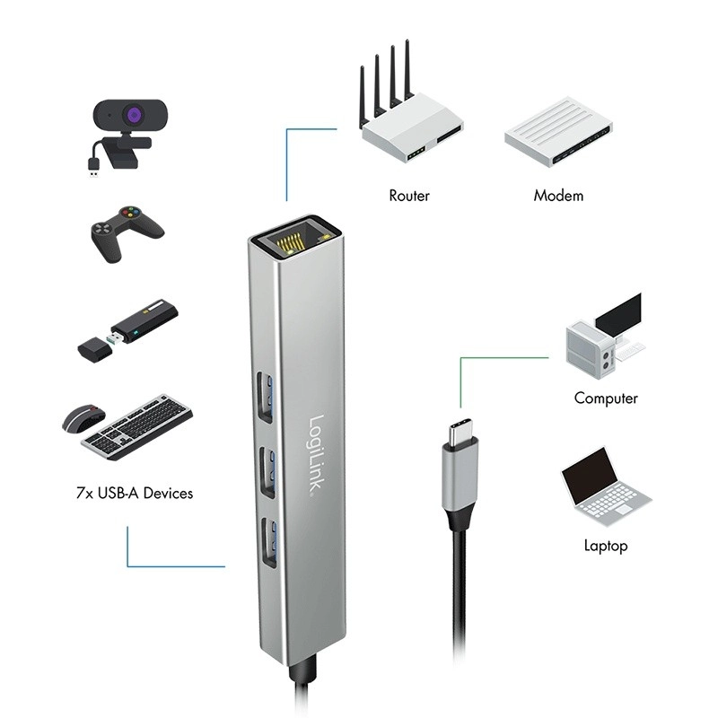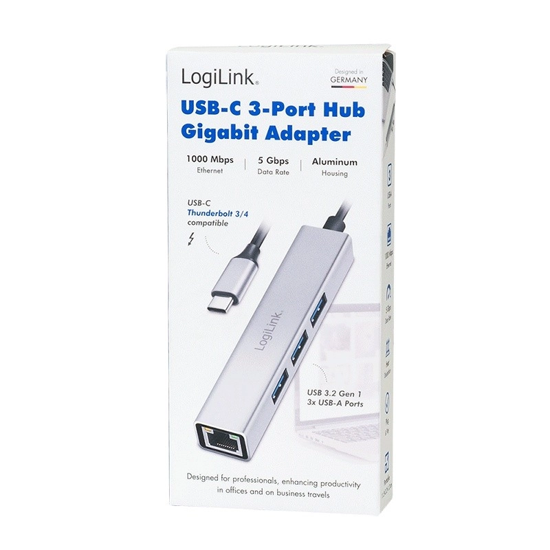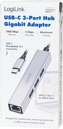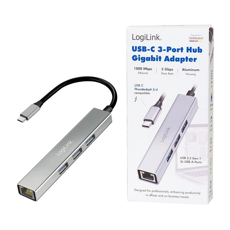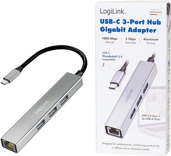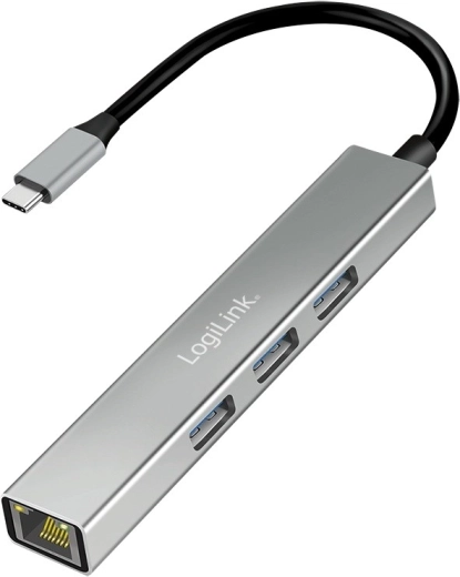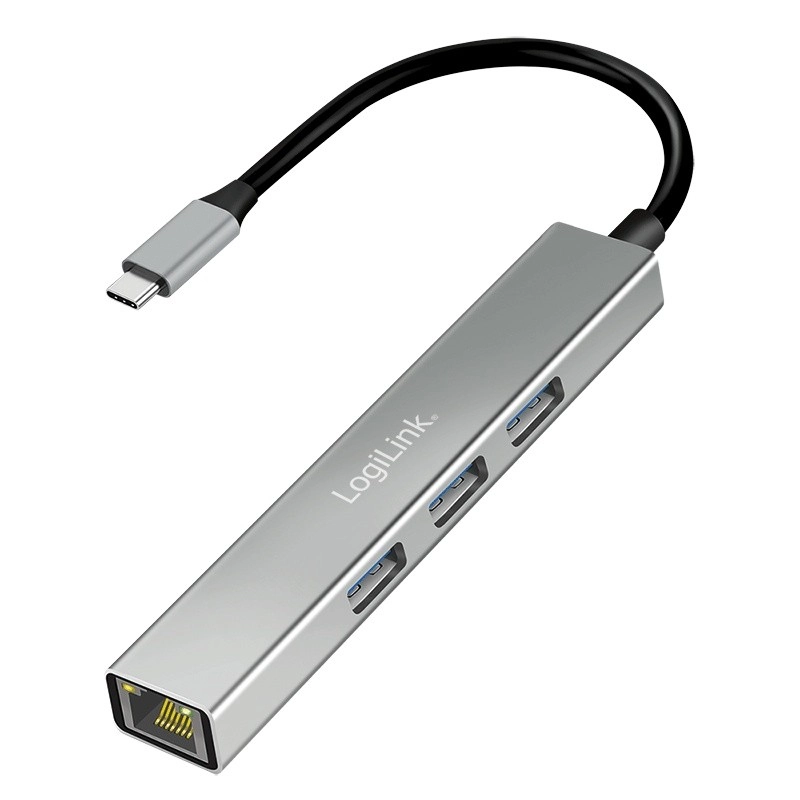 LogiLink USB-C hub 3× USB‑A and RJ45 Gigabit Ethernet