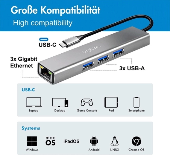 Looking for a reliable way to extend the connectivity of your USB‑C device? This LogiLink hub adds Gigabit Ethernet for a stable network and lets you connect a keyboard, mouse, or flash drive via three USB‑A ports at the same time. Thanks to plug & play technology, just plug it in and start using it immediately.