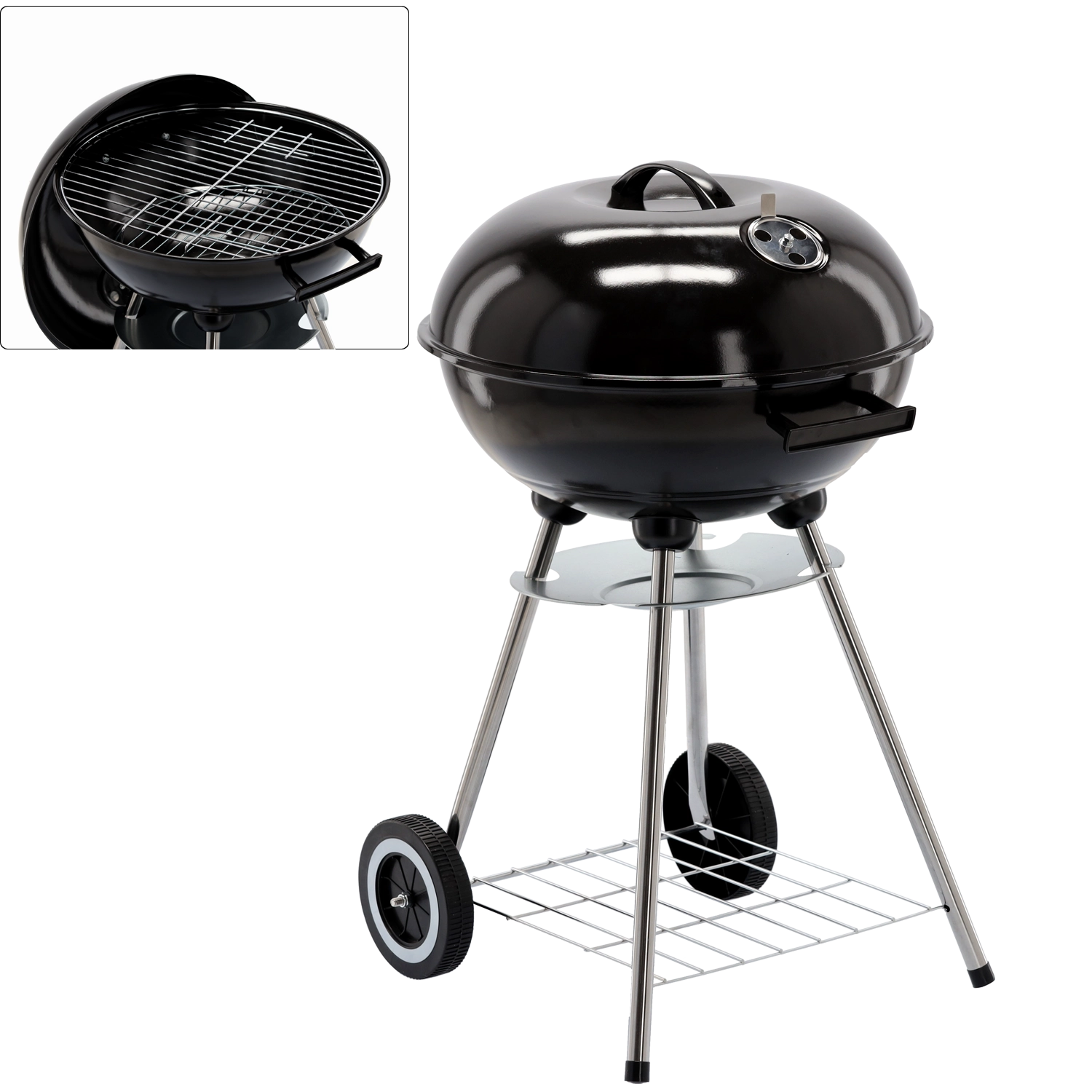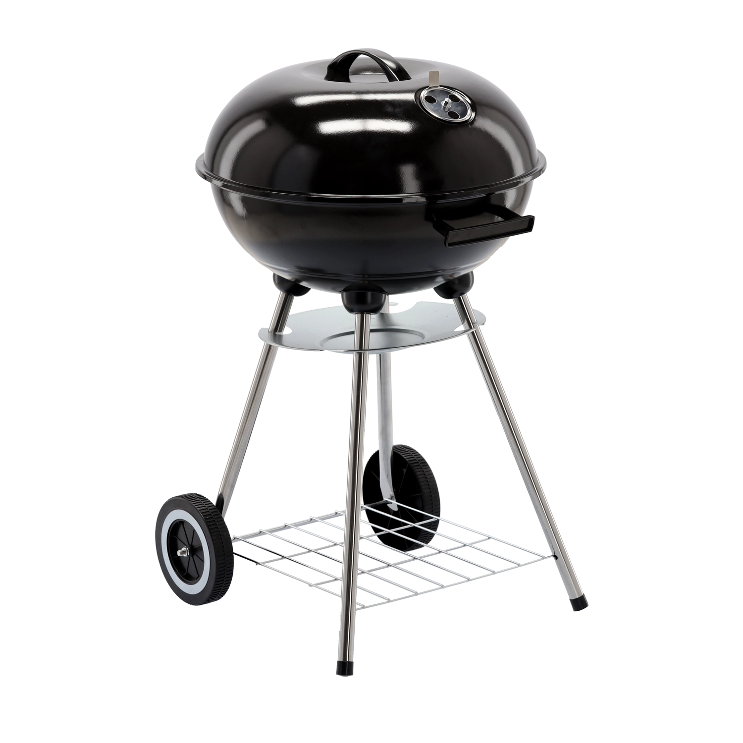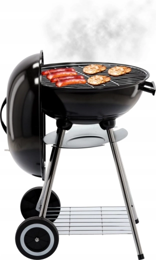 The practical design with two wheels allows easy relocation, the bottom wire shelf keeps fuel and utensils at hand, and the ash catcher simplifies cleaning after each grilling session. A stable tripod with metal legs gives the grill confidence even on uneven surfaces.