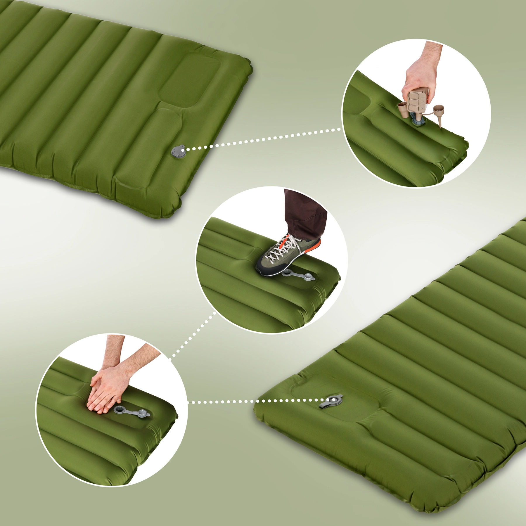 The built-in foot/hand pump lets you inflate the pad effortlessly without extra gear. You can also connect an external pump via the valve.