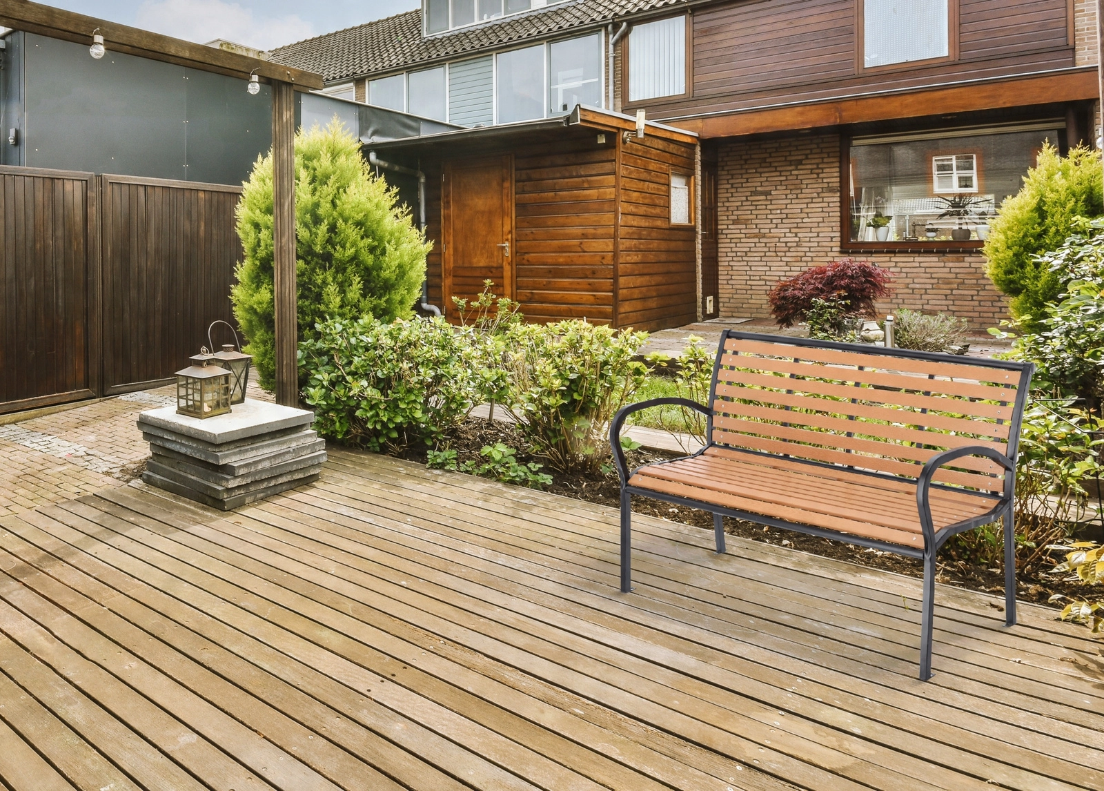 Plastic slats in a brown wood-look finish resemble timber but withstand rain and sun better and require only minimal maintenance.