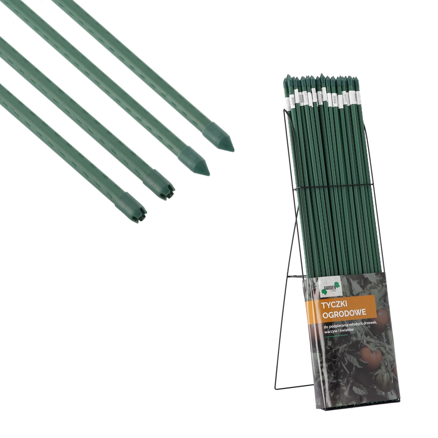 A practical support stake for garden plants, 120 cm long and 16 mm in diameter, ensures their stability and protection against breakage. The durable steel construction with a polyethylene coating is suitable for flowers, vegetables, and shrubs. Thanks to the green color, it blends in with the foliage for a discreet look, the sharpened tip makes insertion into the soil easy, and the ridges along the entire length prevent slipping. An included steel stand provides convenient use.