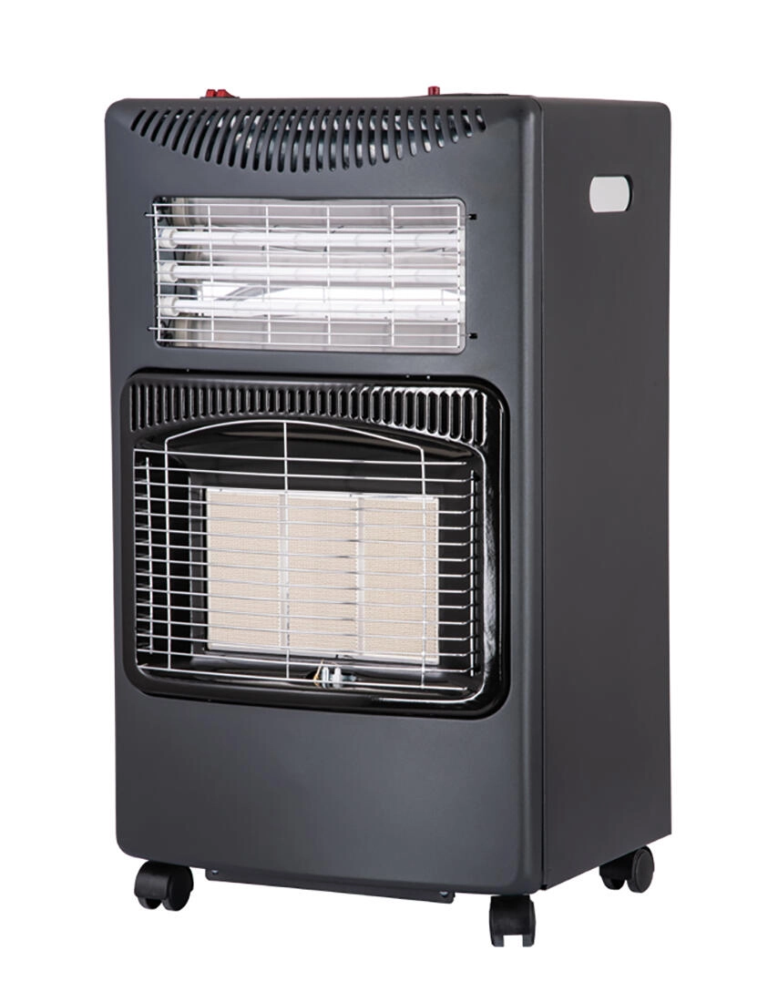 Universal portable heater with the option to heat using propane–butane (LPG) or electricity provides reliable warmth at home, in a cottage, or in a workshop. It offers gas output up to 4.2 kW, electric output 1200 W, a safety tip-over switch, piezo ignition, and wheels for easy moving. Ideal wherever no other heat source is available.