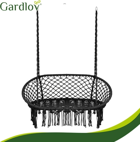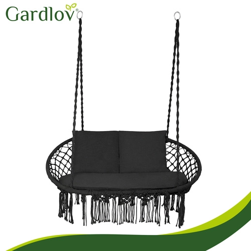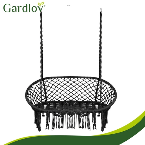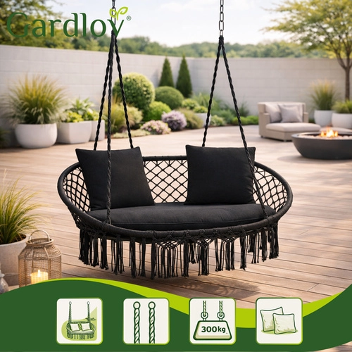 The GARDLOV hammock chair transforms your outdoor and indoor relaxation zone into a cozy place to unwind. The double seat with soft cushions pleasantly supports the back and allows comfortable sitting or semi-reclining, while the decorative macramé fringes add a modern boho look.
