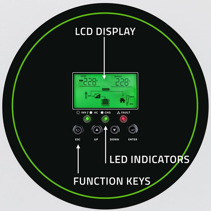 The intuitive display shows voltages, currents, and system statuses. It lets you set AC/Solar priority, input voltage range, and charging current based on your needs.