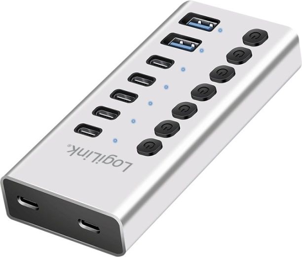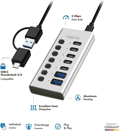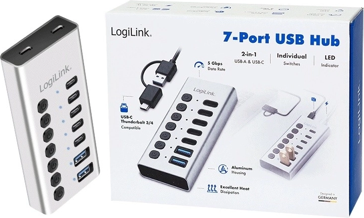 Expand the connectivity of your computer, laptop, or tablet with the powerful LOGILINK USB hub featuring 7 ports, individual switches, and a 2‑in‑1 cable (USB‑A/USB‑C). It offers fast data transfer up to 5 Gbit/s, stable power thanks to the included 20W USB‑C charger, and a durable aluminum body for everyday use at home, in the office, and for gamers.