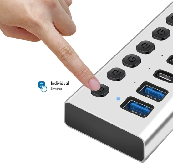 - Individual on/off switches with LED indication for each port