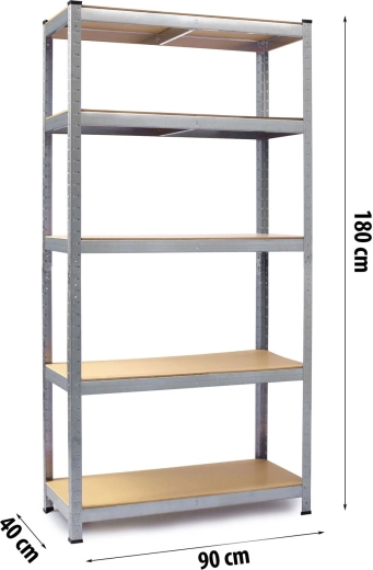 Stable steel structure with galvanized profiles and five durable MDF shelves. Perforated uprights allow easy height adjustment.