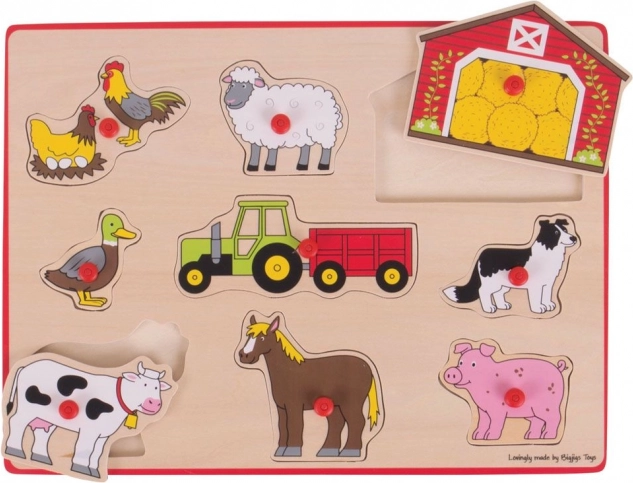 The Insert Puzzle Farmstead from Bigjigs Toys offers fun and educational moments for children. Match each colorful piece to the correctly shaped hole on the baseboard. This wooden puzzle helps develop vocabulary and the association of shapes, colors, and images.