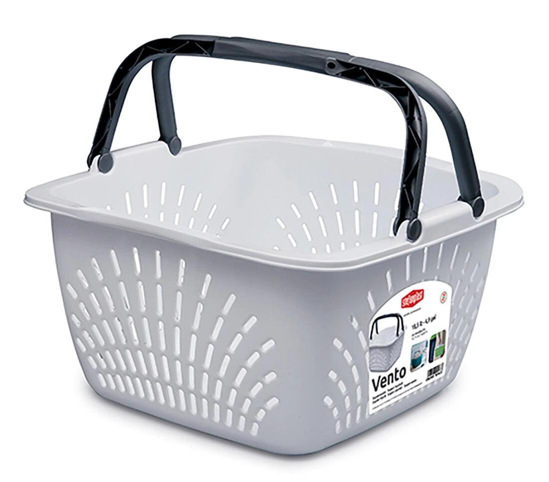 The practical and durable shopping basket VENTO makes everyday shopping and carrying items at home easier. It offers 2 folding handles for comfortable carrying, a capacity of 18.5 l, and a load capacity up to 15 kg. The lightweight plastic body with ventilation holes ensures durability, easy maintenance, and breathability of the contents. Available in a mix of colors to match your style.