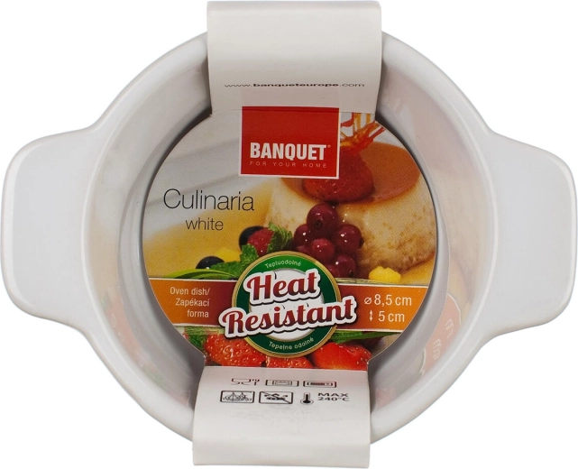 The practical round CULINARIA baking dish with a diameter of 8.5 cm is ideal for portions of desserts, dips, and sides. It offers durable ceramic, practical handles for safe carrying, a glossy white glaze, and a wavy relief for elegant serving. Oven-safe up to 240 °C.