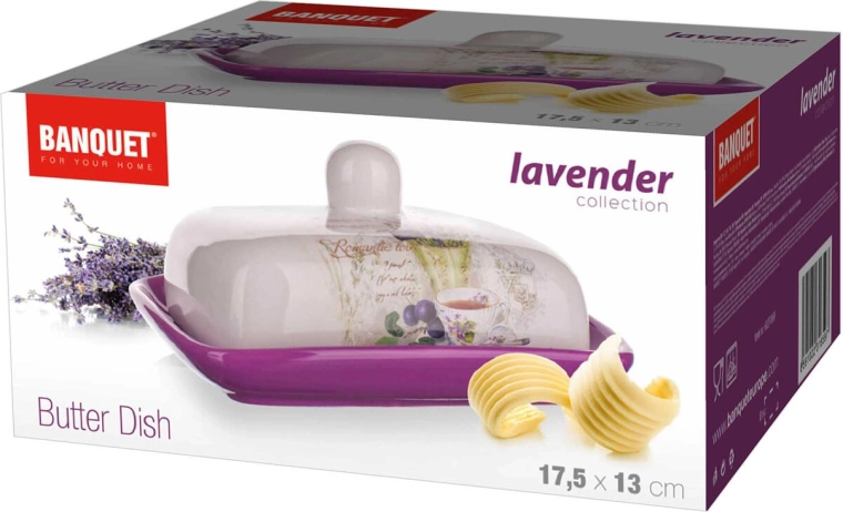 A stylish ceramic butter dish with a lavender motif in an elegant purple-and-white glaze keeps your butter fresh and ready to serve. The practical size 17.5 × 13 × 8 cm fits a standard stick of butter and adds a touch of gentle Provence charm to your kitchen.