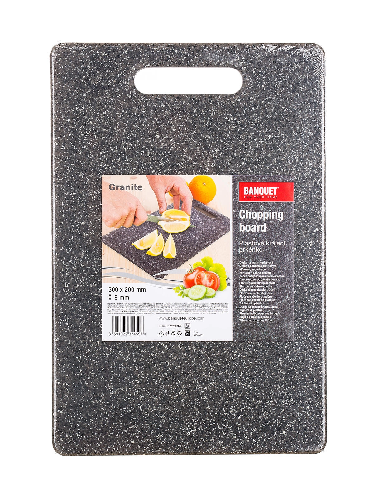 Practical plastic cutting board with an elegant granite look for everyday cooking. It offers a stable and durable work surface, easy maintenance, and is gentle on both steel and ceramic knives.