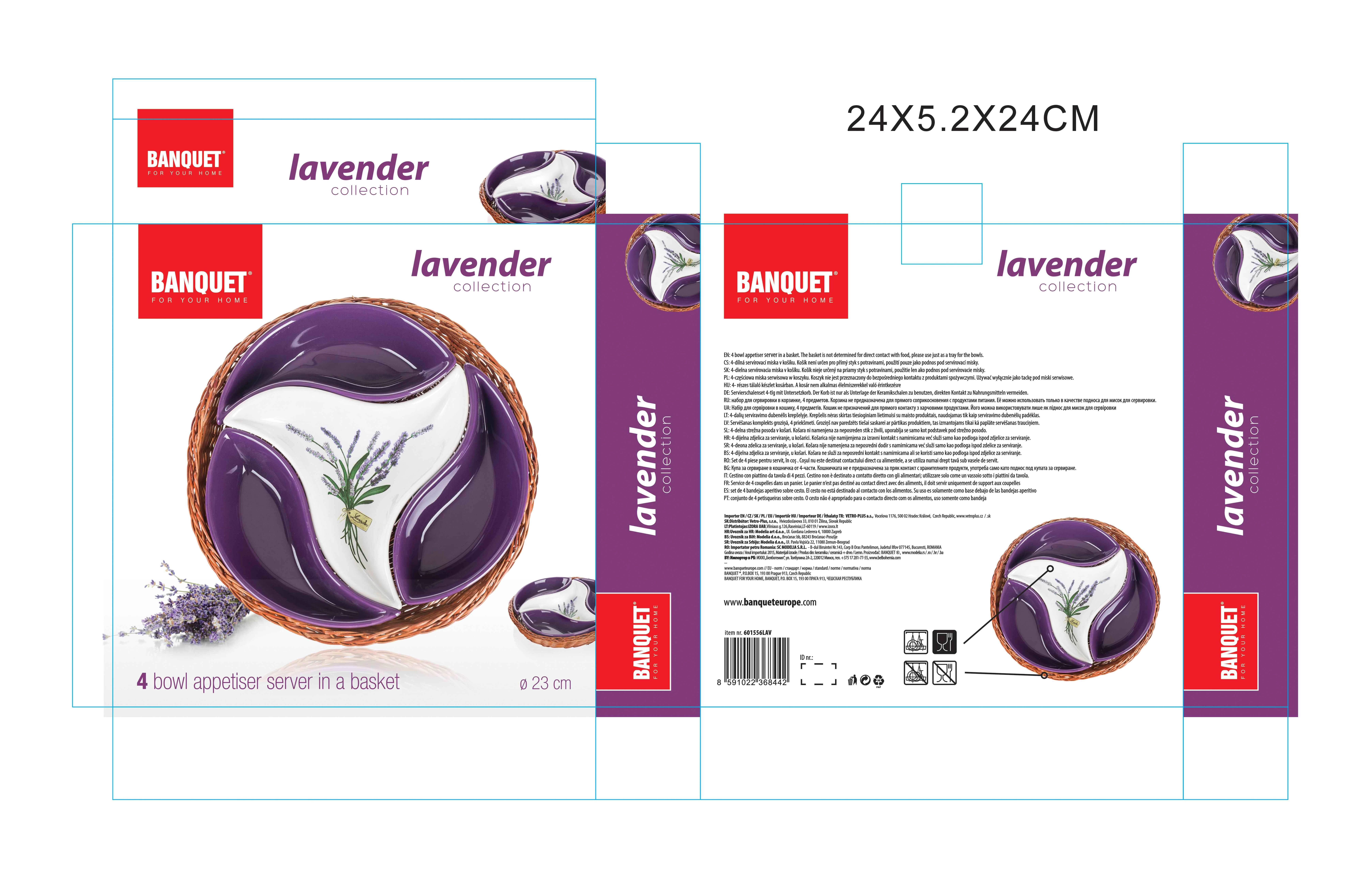This designer LAVENDER set brings a gentle Provençal touch to your table. The four-piece glossy glazed ceramic bowls are set in a round wicker basket that makes serving and carrying easier. Ideal for tapas, dips, olives, nuts, or sweet treats.