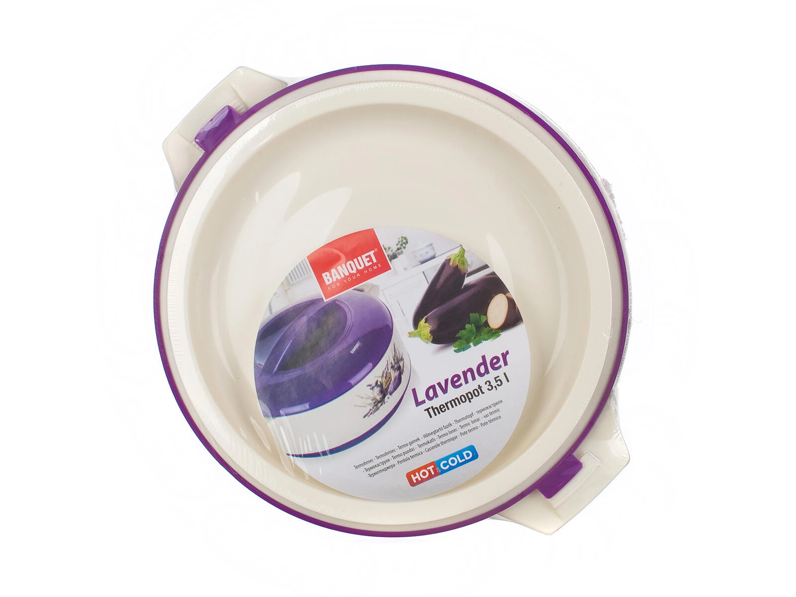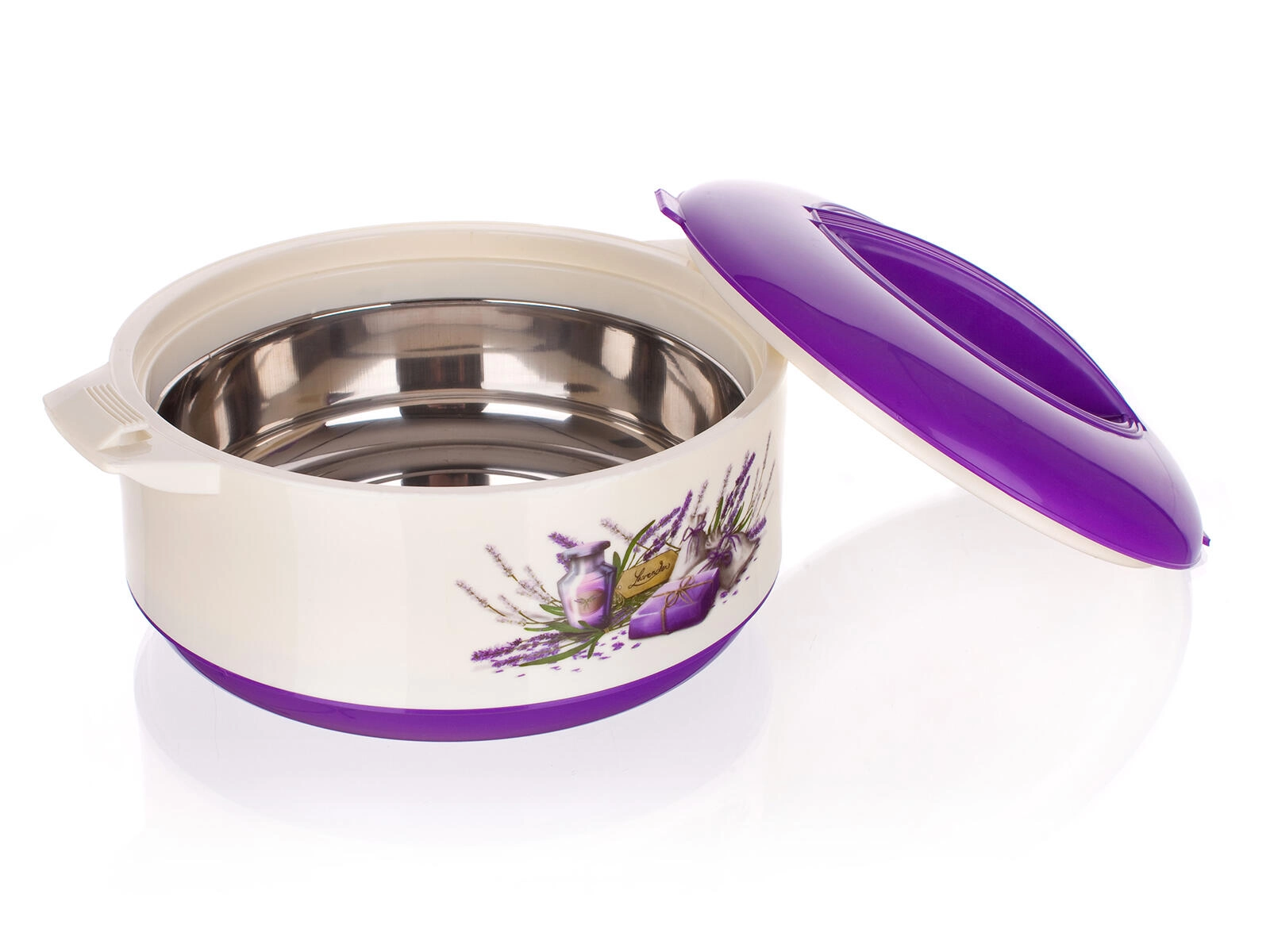 The Lavender Thermal Serving Bowl 3.5 L is a reliable helper for any kitchen. Thanks to the combination of a stainless steel inner insert and PUR foam filling, it effectively maintains the temperature of dishes—whether hot or cold. Durable plastic with a lavender motif adds a pleasant look to serving, and the lid ensures safe transport without spills.